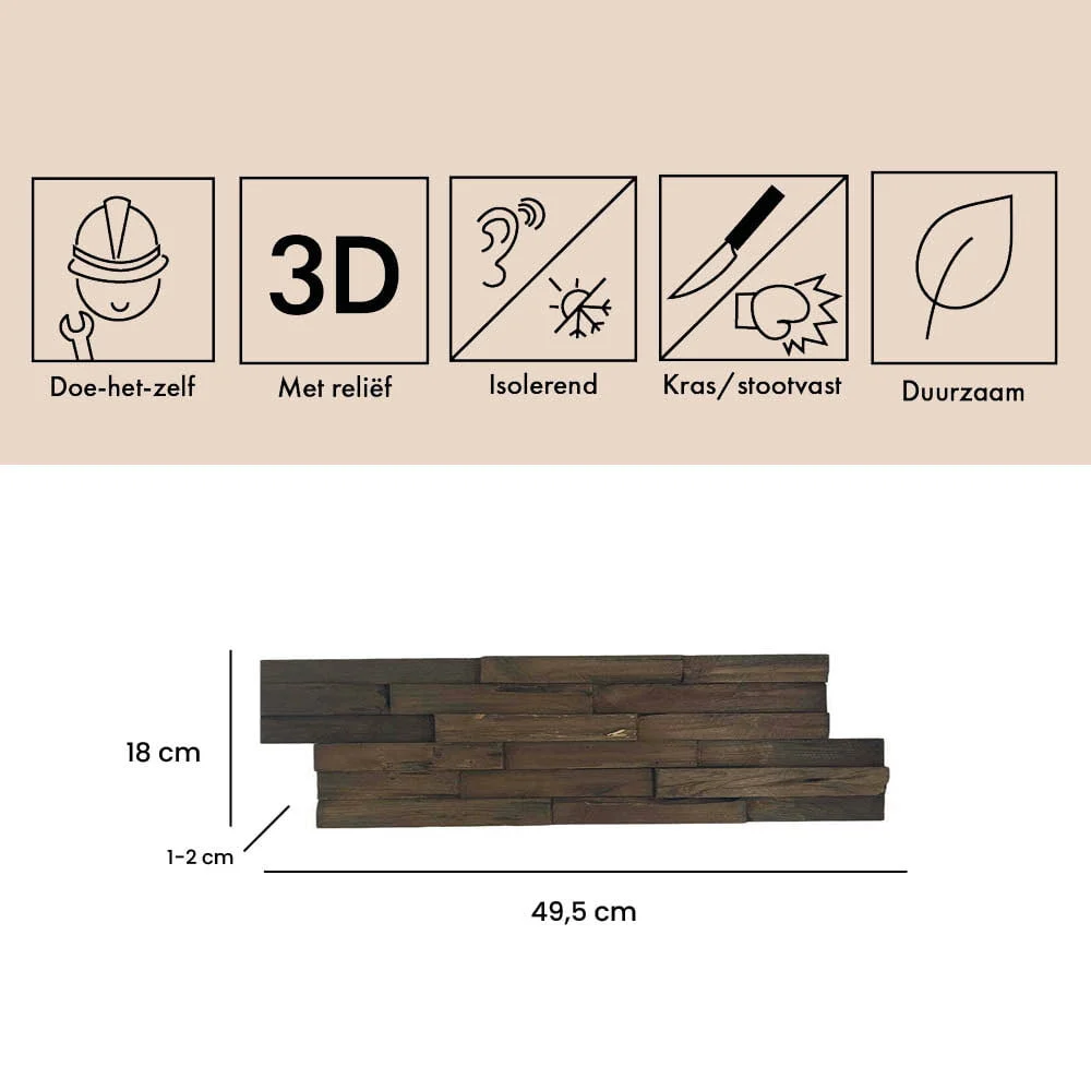 De Houtstrip Teakhout Plank heeft een afmeting van 49,5 × 18 × 2 cm en is een houten wandbekleding met een zichtbare 3D-structuur. Dankzij de natuurlijke houtuitstraling ontstaat een warme en tijdloze sfeer in diverse binnenruimtes.
